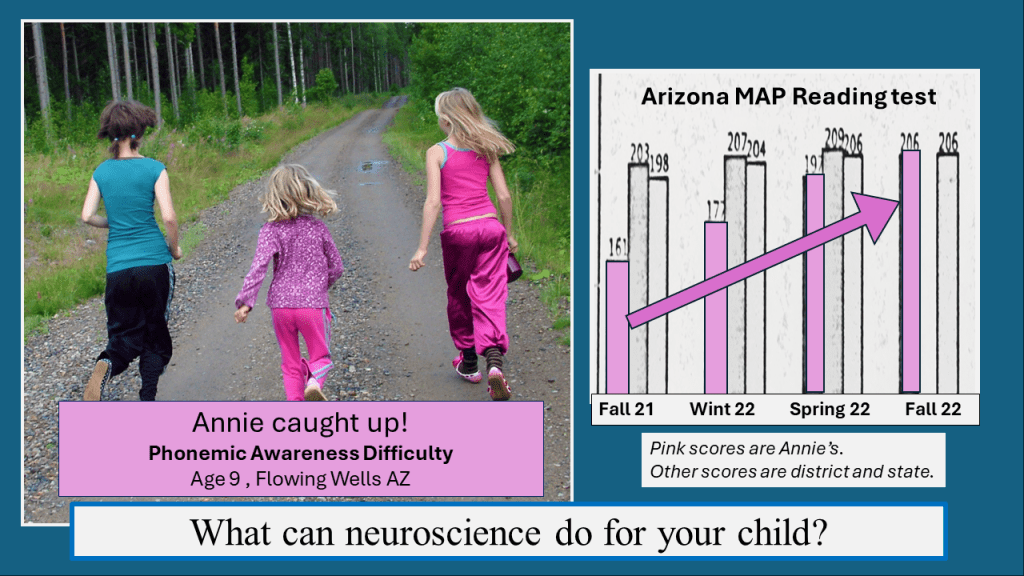 Annie played the Fast ForWord brain games four days a week for six months to raise her auditory processing speed and perception. Poor phonemic awareness in K-2 strongly indicates that dyslexia will be diagnosed in Grade 3, but one year later Annie was no longer headed for special ed. She accelerated her growth and caught up with other children in reading. She had no other reading program during this time. (My personal student.)