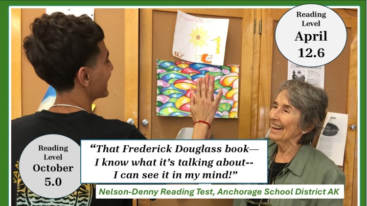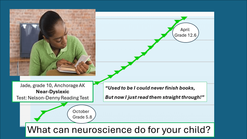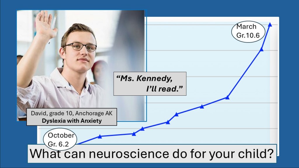 David played the Fast ForWord brain games four days a week for four months to raise his processing speed for auditory perception. Since he had entered my English class in September, he had avoided eye contact with me, staring at his hands, praying that I would not call on him to read. He soon failed the first round of Alaska’s exit exam for graduation and was assigned to my FF reading lab. In March, on his first day back from the lab, David raised his hand to read aloud. He read flawlessly. Tears in my eyes. Time between the school-administered Nelson-Denny reading tests was five months. During that time, David had no other reading program beyond regular school assignments, just Fast ForWord.