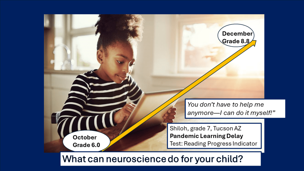 It didn’t take long for Shiloh to fall behind when she was out of school for a year and then in remote-learning classes, so her mom jumped at the chance to enroll her in my FF group when it was offered. Shiloh played the Fast ForWord brain games five days a week for two months to accelerate her learning and raise her reading level. She had no other reading program during this time.
