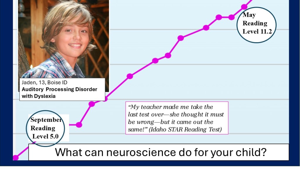 Jaden played the Fast ForWord brain games for five days a week for eight months to raise his processing speed for auditory perception. He worked for 20 minutes before school every day, then 30 minutes after school. School STAR testing showed a reading gain of 6.2 years. Summer retesting for APD showed that he had moved into the low-normal range for overall auditory processing — he no longer had APD! (His mother has given me permission to provide the audiologist’s report to those who request it.)