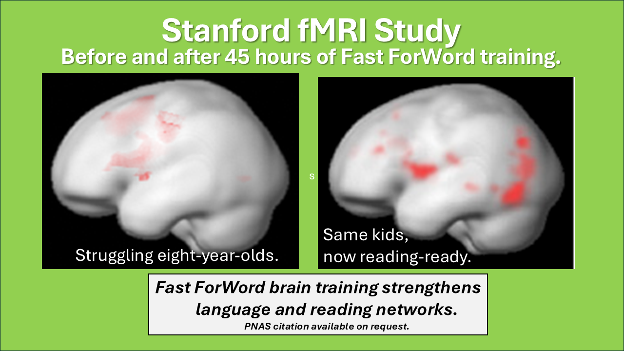 Above: Stanford University fMRI images of brain engagement in twenty children before and after Fast ForWord training. (Images slightly compressed for phone view.) https://www.pnas.org/doi/10.1073/pnas.0030098100