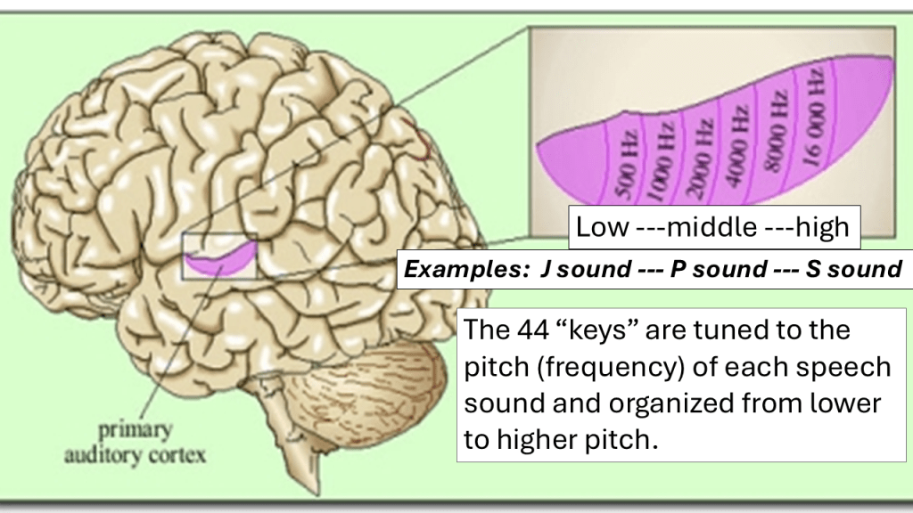 All our language abilities depend having a functional auditory system. Think about sounding out words. for example. The visual image “DOG” signals the auditory cortex first to play the key for the D sound, then the key for the O sound, then the key for the G sound. all in perfect order and in rapid succession, like an arpeggio on a piano. (“Keys playing” refers to neurons firing.)